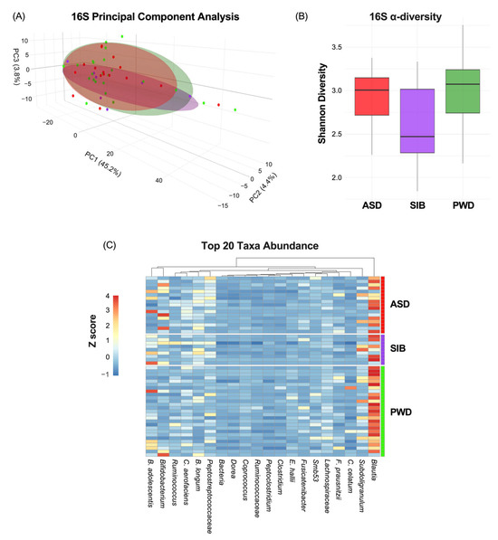 Microbiome variation across ASD, SIB, and PWD groups. (A) PCA of 16S profiles showed no significant association between β-diversity and ASD diagnosis (PC1: 45.2%; PC2: 4.4%; PC3: 3.8%). (B) Shannon index α-diversity did not differ among groups (pairwise Wilcoxon tests, all p > 0.05). (C) Heatmap analysis revealed negligible variability in taxa composition among the groups.