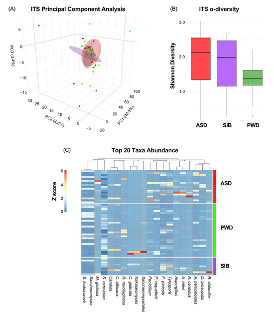 Mycobiome diversity and taxonomic composition across ASD, SIB, and PWD groups. (A) PCA of ITS profiles showed no significant association between β-diversity and ASD diagnosis (PC1: 40.5%; PC2: 4.6%; PC3: 3.4%). (B) α-diversity, assessed by the Shannon index, did not differ significantly among groups (pairwise Wilcoxon tests, all p > 0.05). (C) Heatmap of relative fungal abundances revealed minimal compositional differences, with Kruskal–Wallis tests identifying significance only for Aspergillus candidus and Aspergillus tritici (p < 0.05). Pairwise Dunn’s tests showed that these differences were driven by comparisons with the PWD cohort, but not between ASD and SIB groups.