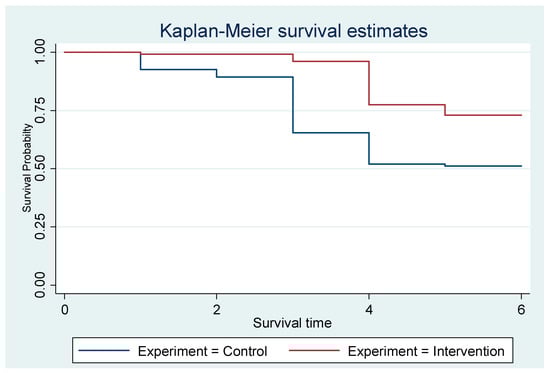 Both interventions and controls start at a survival probability of 1.0 (100%), as all mothers are exclusively breastfeeding at the beginning. However, the intervention group maintained a higher survival probability than the control group throughout the six months. The control group shows a steeper decline in survival probability, indicating that mothers in this group stop EBF rapidly. By the end of the observation period (six months), the survival probability for the intervention group is noticeably higher than for the control group (Figure 2).