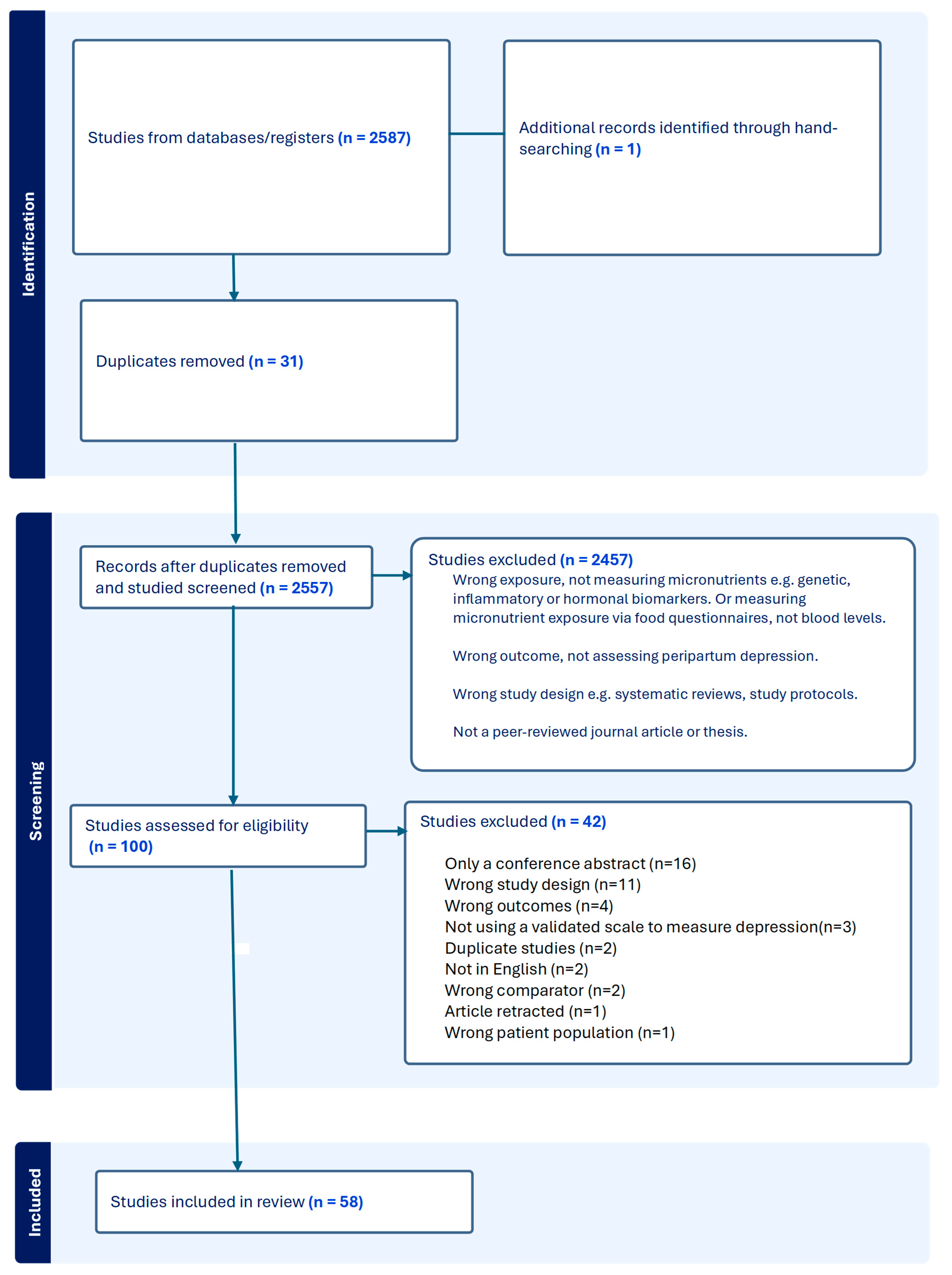 A structured narrative synthesis was conducted to summarise and compare the findings across all included studies. Data was extracted from each article with regard to author and date of publication; conflicts of interest from authors; funding sources; study design; number of participants; the population from which participants were retrieved, including country and clinic setting; the micronutrients studied and the method that was undertaken; the timing of micronutrients tested in terms of the perinatal period, the depression rating tool used, and the cut-off; the timing of depression assessment in relation to the perinatal period; the statistical methods used to deduce associations between micronutrient levels and depression scores; and the measurement of confounding factors as well as the statistical analysis used to account for these. Descriptive statistics reported in the original publications, including medians, ranges, percentages of events, and confidence intervals, where available, were extracted and presented to outline the variability in clinical outcomes across studies and subgroups. Summary tables and figures were constructed to display study characteristics, intervention details, and reported outcomes in a clear and consistent format. Results were organised according to the micronutrient examined.