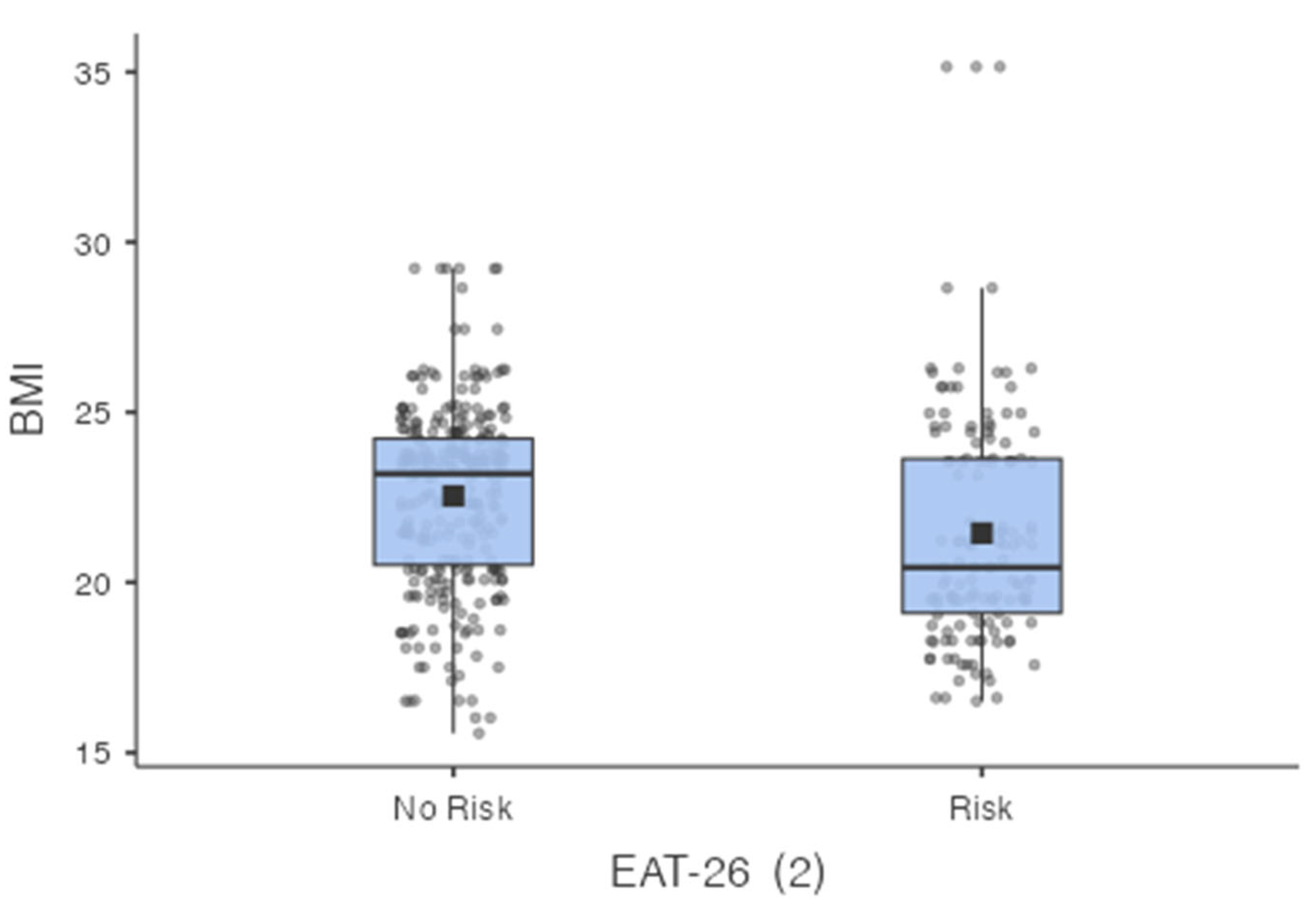 Figure 2 presents a comparison of body mass index (BMI) values between respondents classified as having no behaviors indicative of an increased risk of eating disorders (No Risk) and those identified as being at increased risk (Risk), according to the EAT-26 questionnaire. The distribution of BMI values in the No Risk group is slightly shifted towards higher values compared to the Risk group. In the increased-risk group, a greater concentration of BMI values is observed in the lower range of the normal BMI category.