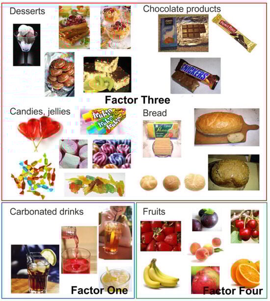 | Factor Four—‘vegetable and fruits, cheeses and spicy dishes’ | Vegetables and salads | 0.76 | 2.02 | 8.09 |