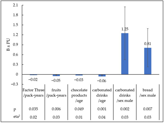 3.2. Regression Model for the Factor Three ‘Sweet Products’ Group Including Variables Such as Sex, Age, BMI, Pack-Years, Olfactory Sensitivity Threshold, and Identification Test of Smell