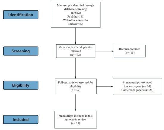 A total of 662 records were initially identified through electronic database searches. After duplicate removal, 472 articles remained for title and abstract screening. Of these, the full texts of 59 studies were assessed for eligibility. Ultimately, 15 studies, consisting of 12 preclinical studies and 3 clinical studies, fulfilled all inclusion and exclusion criteria and were included in the final analysis (Figure 1). Among these, 12 of them discussed the impact of ASs on the skeletal system, 4 of them focused on muscle, and 2 focused on the joint. Notably, some studies reported multiple outcomes: one study addressed both bone and muscle, and two studies examined both bone and joint. No paper reported the ligament and tendon. The characteristics of the included studies, including the species or strain, sex, and age of the subjects, sweetener type used in the study, intervention and grouping, duration of the intervention, assessments are shown in Table 1, and the main results are shown in Table 2.