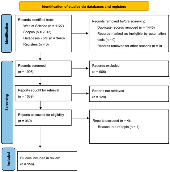 The data extraction process involved two steps and is reported in a PRISMA flowchart (Figure 1). First, only peer-reviewed, English-language journal articles were considered, yielding 1127 articles from WoS and 2313 from Scopus, amounting to 3440 articles. Repetitive articles were manually removed using reference manager, Zotero (Version 7), resulting in 1995 articles for further review. Next, titles, keywords, and abstracts were assessed to determine each article’s suitability for the study. Only articles addressing nutrition or food science-related aspects of the restaurant industry were included. Articles related to the business themes of the restaurant (i.e., organizational behavior, consumer behavior, and finance) sector or lacking full text were not selected [2]. However, articles with business topics focused on nutrition or food science, such as pricing and marketing effects on food choice, were included. Ultimately, 956 journal articles were used for this bibliometric analysis.