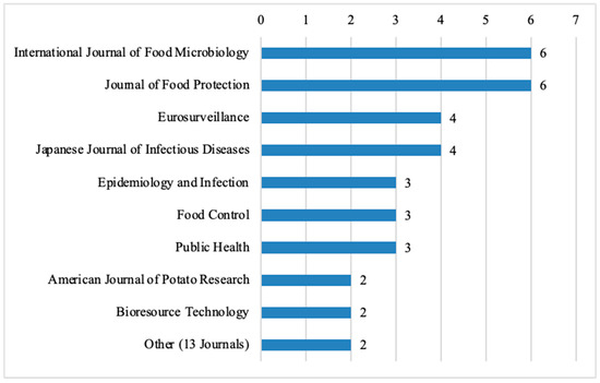 Among the top 10 journals that published the highest number of food science articles, the International Journal of Food Microbiology and the Journal of Food Protection each contributed 6 out of the 132 analyzed articles (4.55%), followed by Eurosurveillance with four articles (3.03%) (Figure 5). Other notable journals include the Japanese Journal of Infectious Diseases with four articles (3.03%), Epidemiology and Infection with three articles (2.27%), Food Control with 3 articles (2.27%), and Public Health with three articles (2.27%). Additionally, the American Journal of Potato Research and Bioresource Technology each published two articles (1.52%). There are also 13 other journals, each contributing two articles (1.52%).