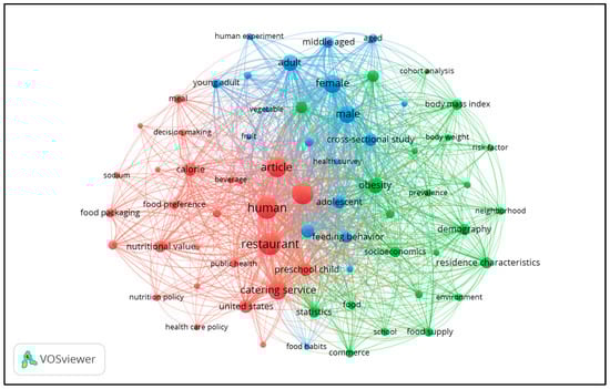 Also prominent in this cluster are keywords that reflect contextual influences, including socioeconomics, residence characteristics, neighborhood, and food supply. Their strong co-occurrence with health-related terms suggests that the literature frequently examines how factors such as income, community characteristics, and local food environments intersect with nutrition and health outcomes in relation to foodservice venues. The proximity of these environmental terms to health outcome keywords underscores an interest in learning how place-based and social conditions may shape dietary patterns.