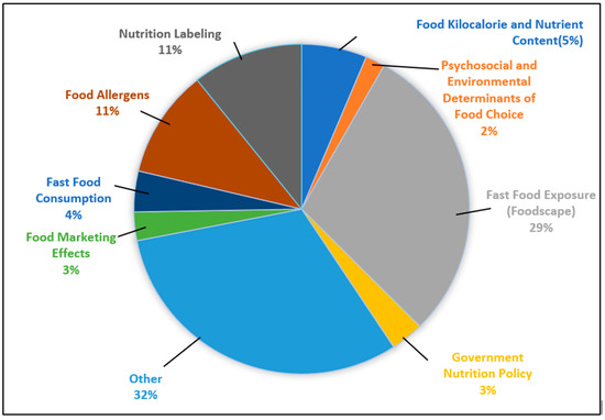 The most frequently represented theme was fast food exposure (foodscape), accounting for 29% of the articles. Research in this area emphasized the influence of the external food environment, particularly the density, accessibility, and spatial distribution of fast-food outlets on dietary patterns and public health outcomes. Nutrition labeling was another prominent theme, representing 11% of the articles. These studies examined the implementation and impact of kilocalorie and other nutritional information provided on menus. A common focus was on whether such labeling impacts consumer choices and supports healthier eating in restaurant settings. Food allergens also accounted for 11% of the dataset, highlighting the challenges consumers face when managing food allergies in restaurant environments. This body of research explored the difficulties individuals encounter in identifying safe menu items, communicating their dietary restrictions, and feeling confident that their needs will be accommodated when dining out.