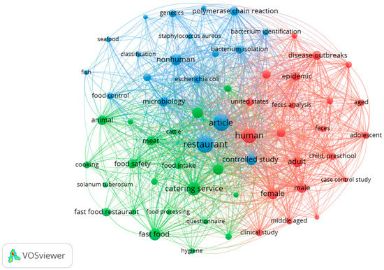 The keyword co-occurrence analysis revealed three major clusters representing distinct thematic areas of research at the intersection of restaurants and food science (Figure 8). The network visualization shows keyword groupings that highlight the scope and relationships between key topics in the literature. Out of the 1994 keywords, a co-occurrence analysis revealed 61 keywords that met the threshold for the minimum number of keyword occurrences (n = 5). These keywords were grouped into three thematic clusters: red, blue, and green.