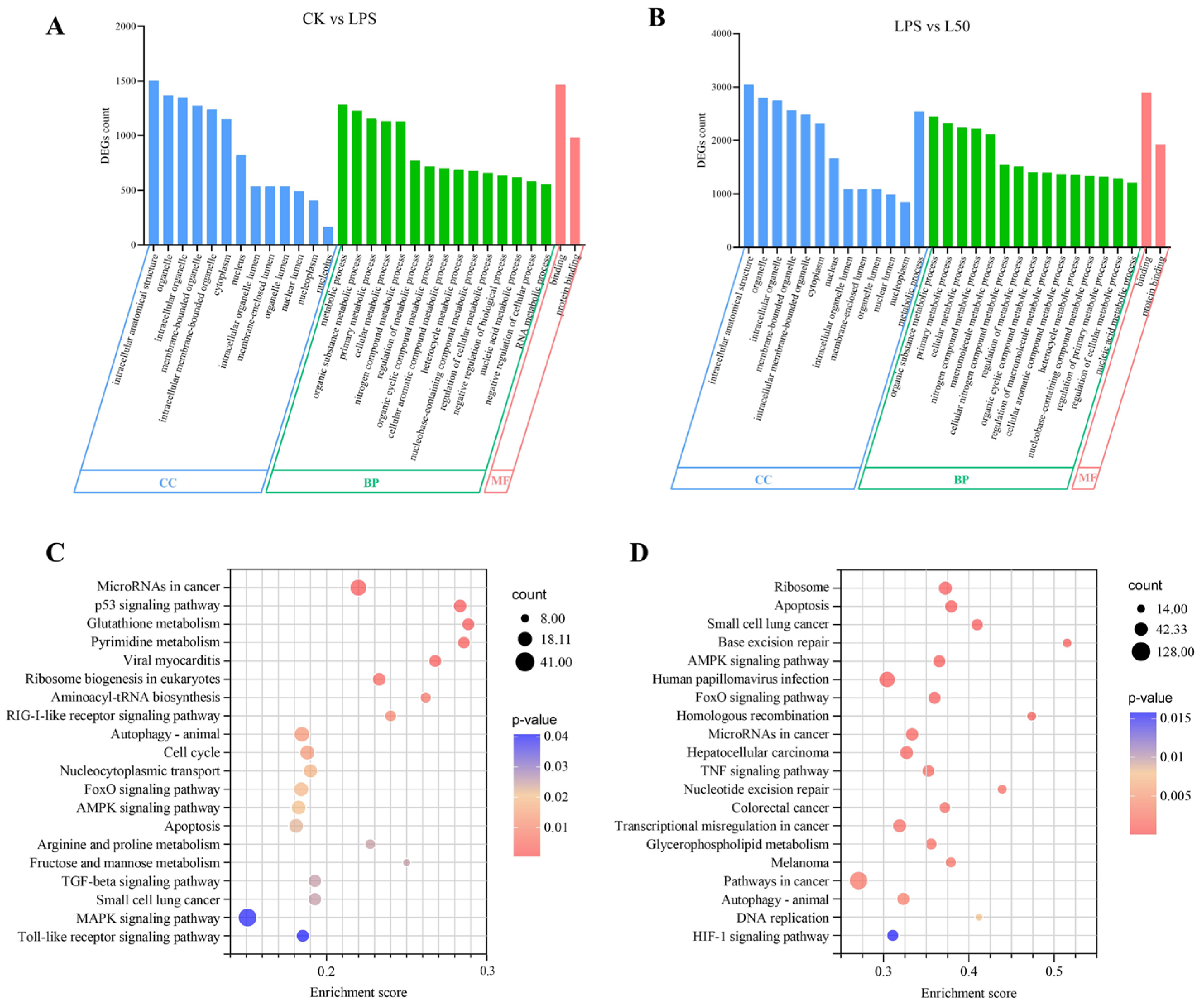 Figure 2. Enriched Go terms for DEGs of CK vs. LPS (A) and LPS vs. L50 (B). Results are summarized for the three main GO categories, including biological process (BP), cellular component (CC), and molecular function (MF). KEGG enrichment classification of DEGs of CK vs. LPS (C) and LPS vs. L50 (D).