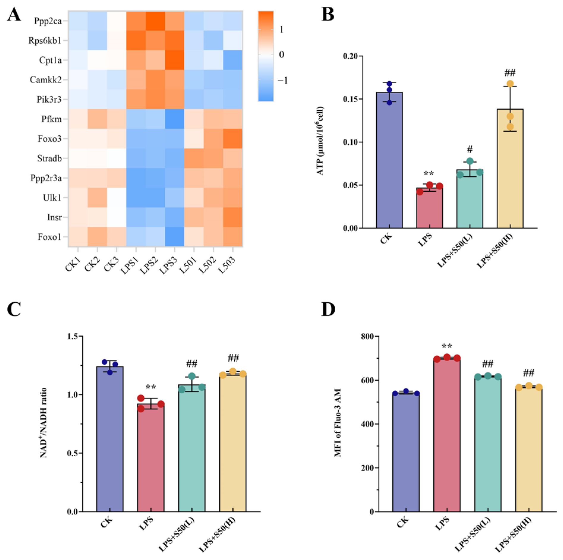 Figure 4. Heat maps of the expression profiles of 12 DEGs involved in the AMPK signaling pathway (A), different treatments affect the endogenous ATP content (B), NAD+/NADH content (C) and intracellular Ca2+ levels detected by flow cytometry (D). The vertical bars indicate standard deviation (n = 3). Data are presented as the mean ± SD. Asterisks indicate statistically significant differences between CK and LPS (**, p < 0.01). Pound signs indicate statistically significant differences between LPS and L50 (#, p < 0.05; ##, p < 0.01).