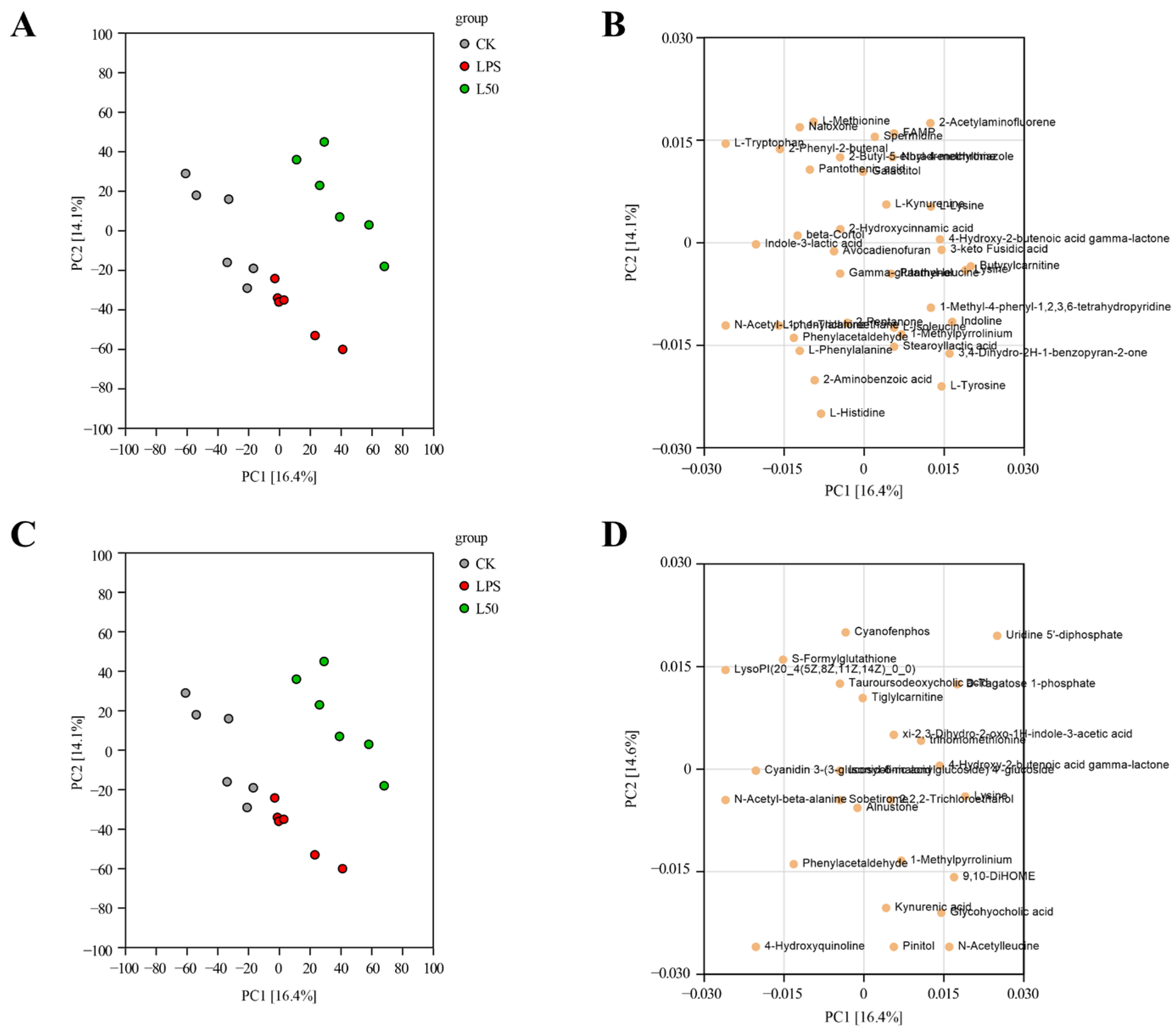 Figure 7. PCA scores and loading plots of the three different treatment groups: positive-ion mode (A,B); negative-ion mode (C,D). CK represents the control group, LPS represents the group treated with LPS, and L50 represents the group treated with LPS and 50% ethanol extract.