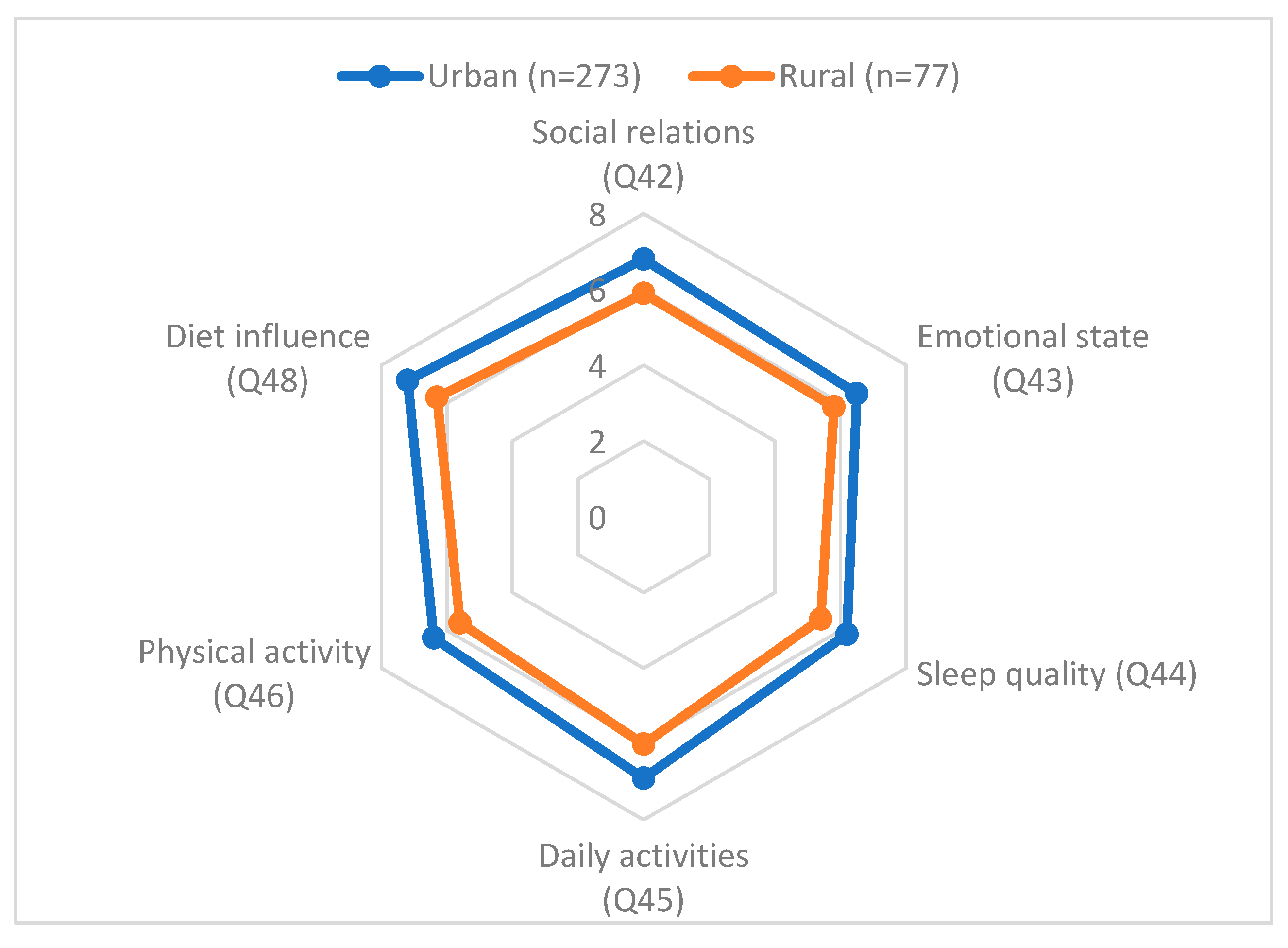 The chart demonstrates that urban patients scored consistently higher across all dimensions, with the largest gaps observed in dietary influence (7.2 vs. 6.3) and daily activities (6.9 vs. 6.0). Rural patients reported lower scores in sleep and emotional well-being, indicating a more vulnerable profile. This visualization underscores disparities by place of residence and highlights areas where rural patients may require targeted support.