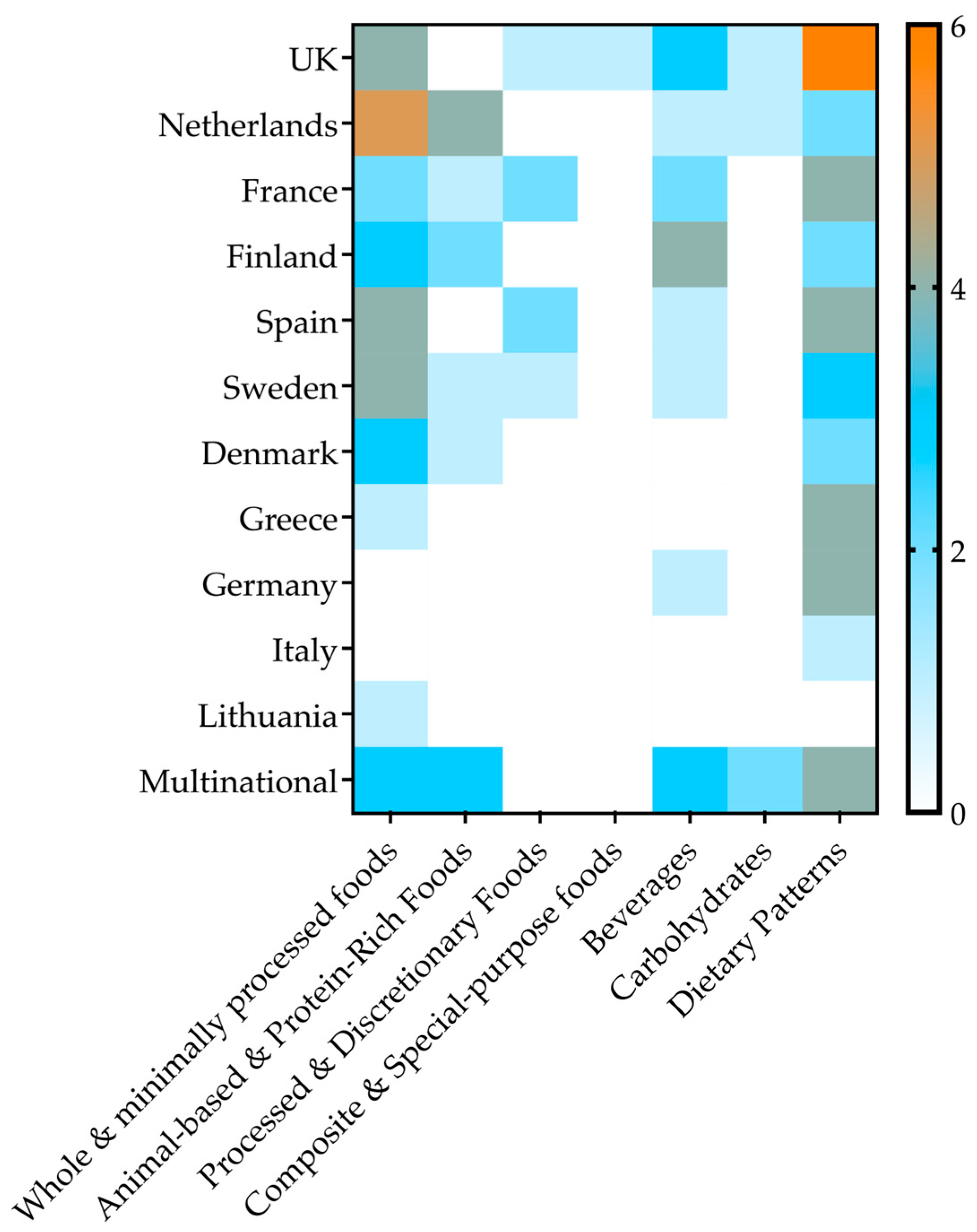| Whole & minimally processed foods | 30 | Finland; France; Spain; Germany; Italy; UK; Sweden; Lithuania; Netherlands; Denmark; Greece |