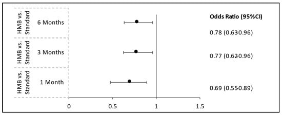 Odds ratios for hospital readmission at 1, 3, and 6 months: HMB-ONS vs. S-ONS, N = 1440. HMB-ONS, β-hydroxy-β-methylbutyrate oral nutritional supplement; ONS, oral nutritional supplement; S-ONS, standard oral nutritional supplement.