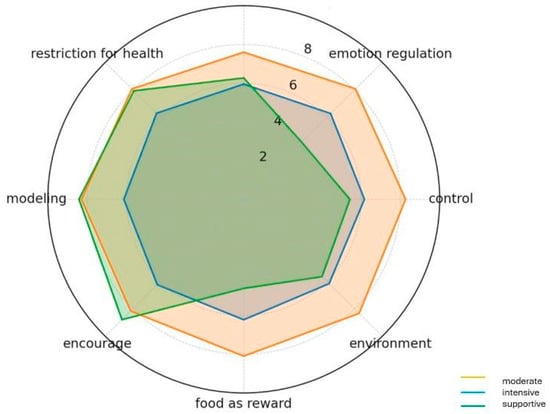Parents in this set use very high support and modeling: encouragement (8.79), modeling (8.41), low emotion regulation (4.18), and food as a reward (4.60). Medium monitoring and control. This may be indicative of a parenting strategy based on positive reinforcement and one’s own example, without relying on the tools of control or food as a reward.
