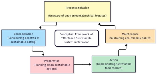 Conceptual framework of TTM-based sustainable nutrition behavior. The diagram illustrates the correspondence between sustainable nutrition behaviors—integrating environmental (e.g., food waste reduction, plant-based choices) and ethical dimensions (e.g., conscious purchasing)—and the stages of the Transtheoretical Model (TTM).
