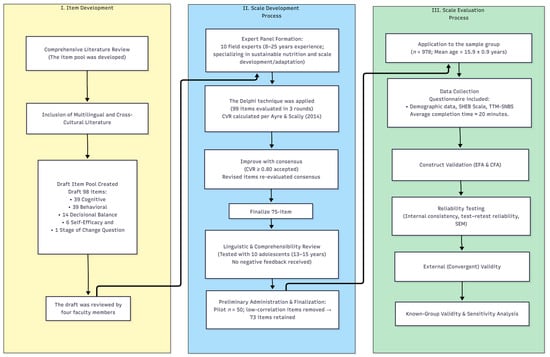 In the final phase of the study, the TTM-SNBS was administered to the target sample, and psychometric analyses were conducted to establish the scale’s validity and reliability. The overall development and validation process is summarized in Figure 2.