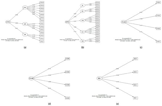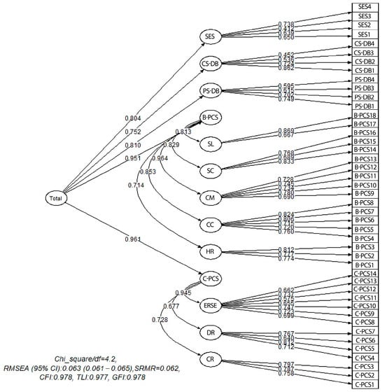 A factor analysis based on total scores across the C-CPS, B-CPS, PS-DB, CS-DB, and SES items indicated that the overall model demonstrated good fit. The corresponding model and fit index values are displayed in Figure 4.