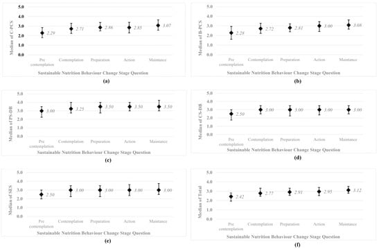 Median scores and interquartile range values of the Sustainable Nutrition Behavior Change question response categories: (a) Cognitive Processes of Change Scales (C-PCS); (b) Behavioral Processes of Change Scales (B-PCS); (c) Pros Scale of Decisional Balance (PS-DB); (d) Cons Scale of Decisional Balance (CS-DB); (e) Self-Efficacy Scale (SES); (f) TTM-SNBS Total Score.