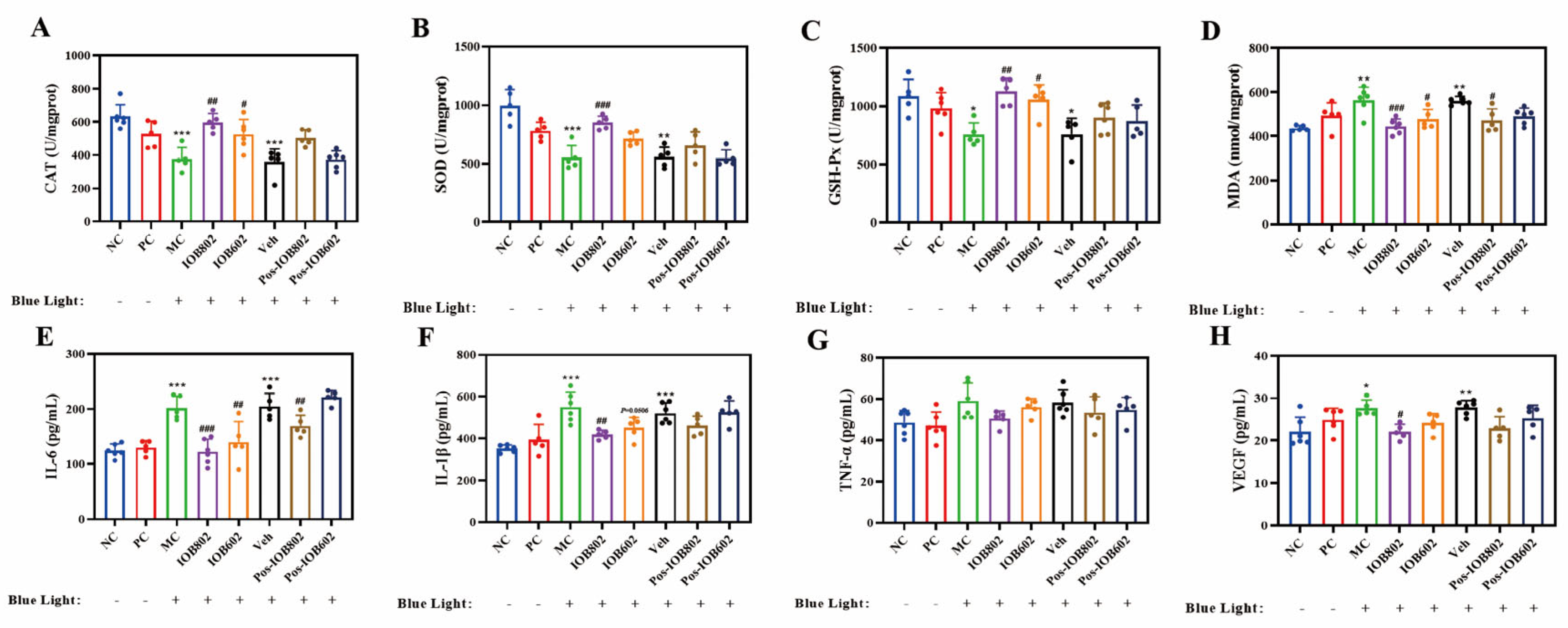 3.3. Effects of IOB802 and IOB602 on Inflammation and Oxidative Stress in Mice with Blue Light-Induced Retinal Damage