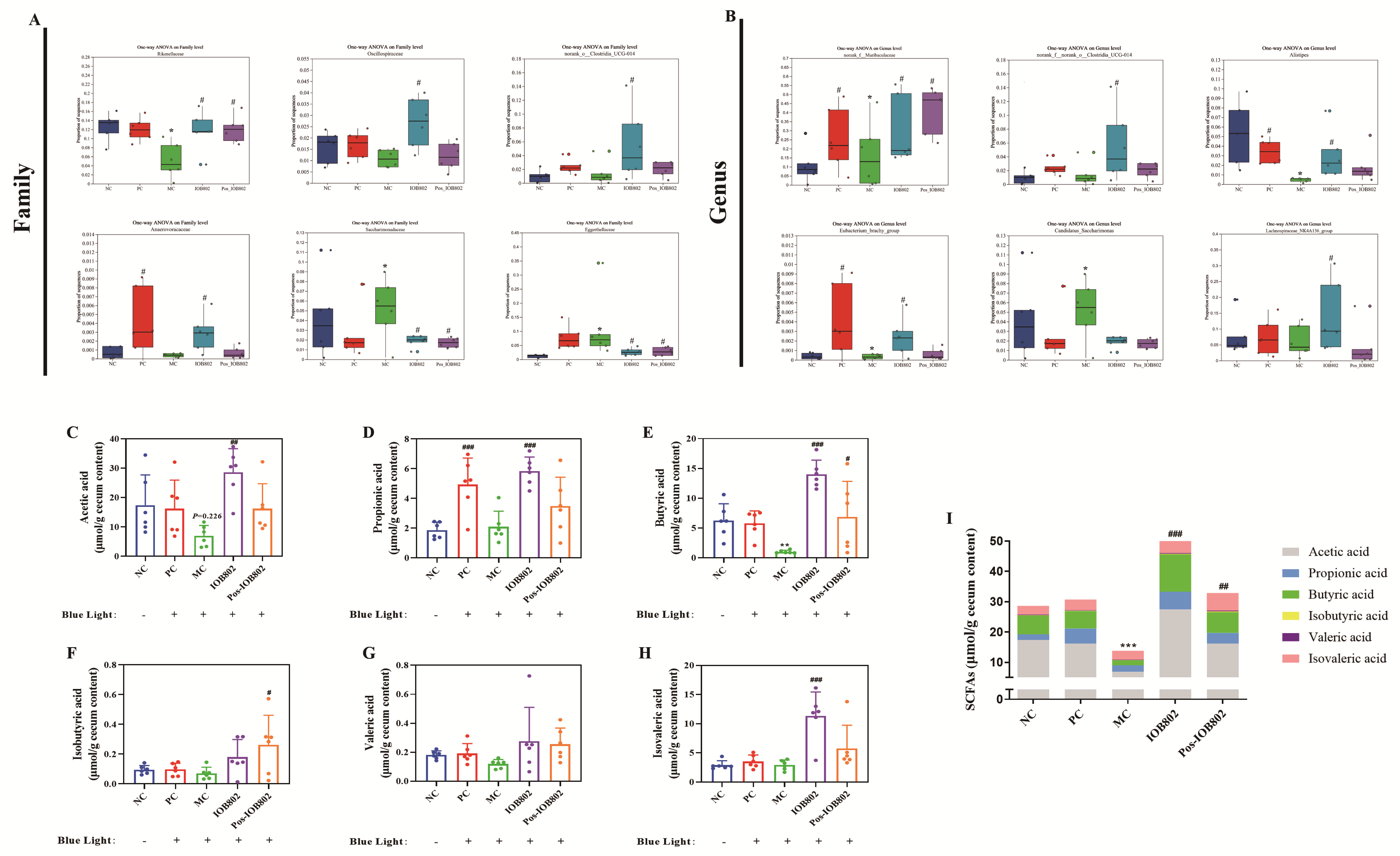 3.5. Effects of IOB802 on Gut Microbiota Composition and Diversity in Mice with Blue Light-Induced Retinal Damage