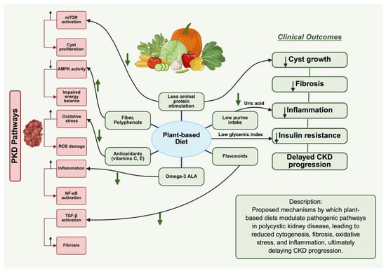 Another important pathway associated with PKD is impaired energy metabolism in kidney cells, which leads to cyst formation [,]. The AMP-activated protein kinase (AMPK) pathway is crucial for regulating cellular energy balance, and its dysfunction can worsen cyst growth [,,,]. Plant-based diets, which are often lower in fat and higher in fiber, may help improve insulin sensitivity and overall energy metabolism [,,,]. The AMPK pathway can be activated by nutrient signals, such as reduced caloric intake or plant-derived polyphenols, which promote cellular energy efficiency [,]. By improving energy metabolism, a plant-based diet can reduce cyst cell proliferation [].