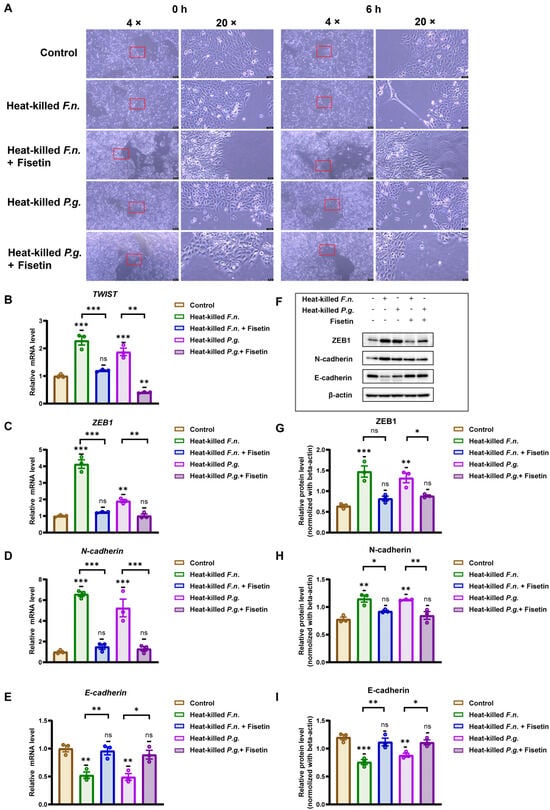 These morphological changes, together with the enhanced migratory behavior, suggest the potential involvement of EMT. To confirm this observation, RT-qPCR was used to assess the mRNA levels of EMT-associated genes. As shown in Figure 3B–E, RT-PCR analysis revealed that treatment with heat-killed F. nucleatum or P. gingivalis upregulated the expression of transcription factors (TWIST, ZEB1) and N-cadherin, whereas it downregulated E-cadherin expression. Notably, heat-killed F. nucleatum induced stronger EMT-associated transcriptional changes than heat-killed P. gingivalis. Co-treatment with fisetin inhibited these changes: compared with that of the heat-killed bacteria-only condition, expression levels of TWIST, ZEB1, and N-cadherin decreased, whereas E-cadherin expression was elevated under co-treatment conditions with fisetin.