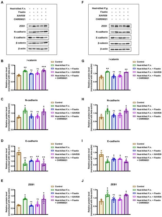 Fisetin counteracts heat-killed periodontal pathogen-induced epithelial–mesenchymal transition (EMT), consistent with modulation of canonical Wnt/β-catenin signaling. (A,F) Western blot analysis of EMT-related proteins expression in OSCC cells co-cultured with heat-killed F. nucleatum or P. gingivalis, with or without fisetin (10 μM), Wnt inhibitor XAV939, or Wnt agonist CHIR99021. (B–E,G–J) Western blotting analysis and quantification results of EMT-associated proteins. Key result: heat-killed bacteria decrease the expression of E-cadherin and increase that of ZEB1, N-cadherin, and β-catenin; fisetin and XAV939 attenuate these changes, whereas CHIR99021 restores them in the presence of fisetin, supporting Wnt/β-catenin involvement. Data are shown as mean ± SD (n = 3). * p < 0.05, ** p < 0.01, and *** p < 0.001, compared with that of the control group.