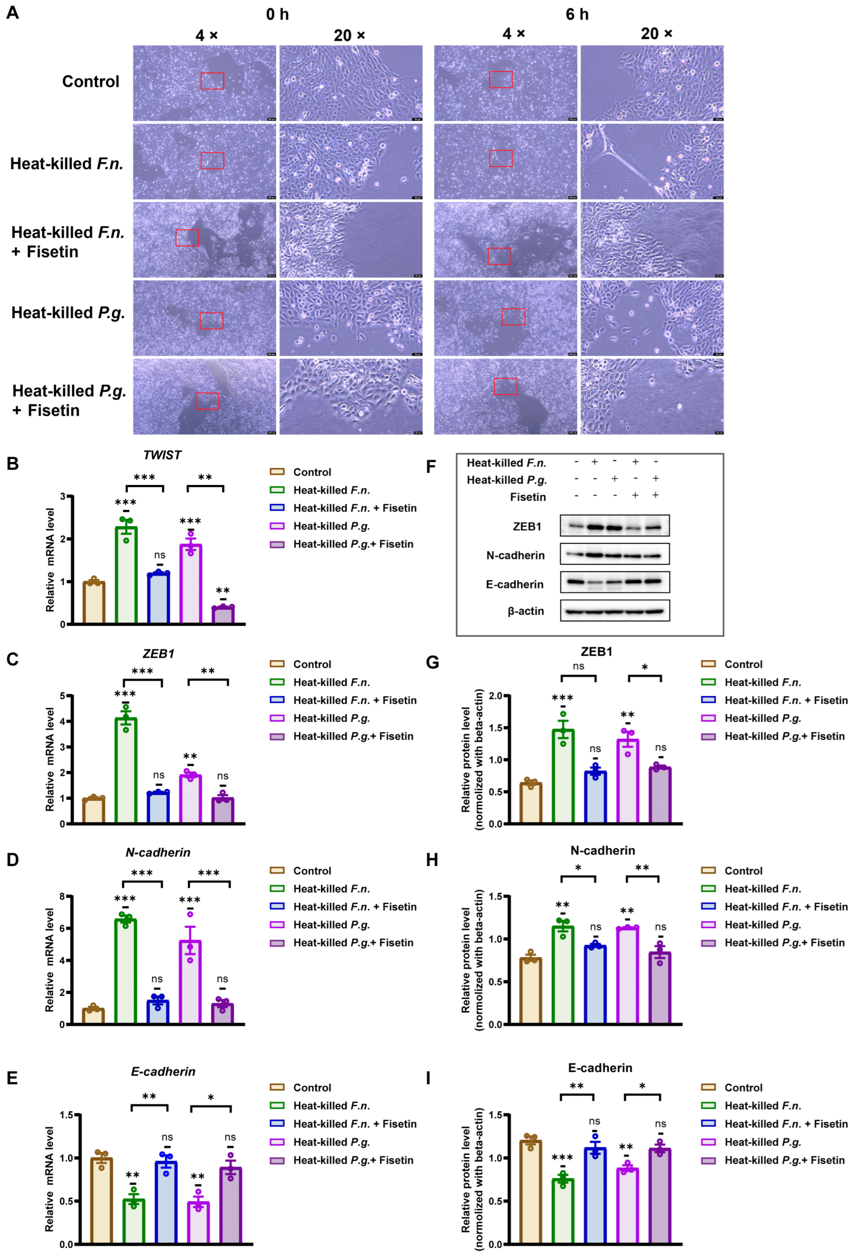 3.3. Heat-Killed Forms of F. nucleatum and P. gingivalis Can Induce the EMT Process in OSCC Cells, but Fisetin Inhibits This Effect