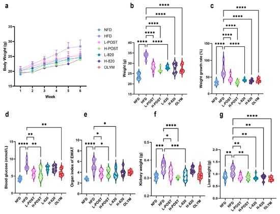 Post-intervention fasting blood glucose measurements revealed significantly higher levels in the HFD group (p < 0.0001 vs. NFD). Notably, both L-POST, H-POST, and OLYM achieved significant glucose-lowering effects (p < 0.01 vs. NFD; Figure 1d). Assessment of epididymal adipose tissue, where the organ index (tissue weight/body weight × 100%) reflects systemic lipid storage, showed a significant increase in the HFD group compared to the NFD group (p < 0.0001; Figure 1e). This increase was reversed in the L-POST, H-POST, and L-820 groups. Similarly, the weights of the liver and kidney, as major metabolic organs, were significantly increased in HFD mice. The low- and high-dose postbiotics and L820 groups significantly reduced kidney weight (Figure 1f). Liver weights were also significantly reduced in all intervention groups compared with the HFD control group (Figure 1g). These findings collectively suggest that both L. rhamnosus IOB820 and its postbiotics exert lipid-lowering and weight-reducing effects through modulation of body weight, glucose homeostasis, and organ indices. Notably, H-POST outperformed the OLYM group in reducing fasting blood glucose concentrations and attenuating kidney and epididymal fat indices.