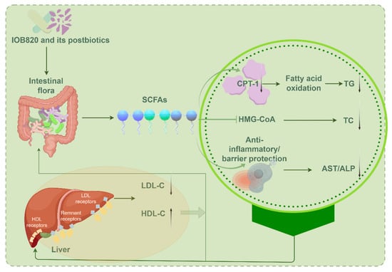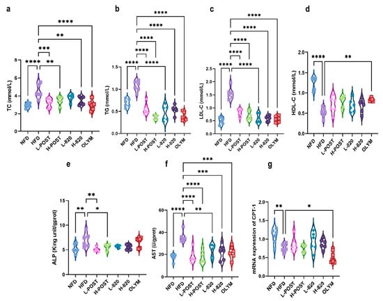 We measured four blood lipids and liver metabolism-related indicators. The results showed that the levels of TC, TG, LDL-C, ALP, and AST in mice following intervention were significantly lower compared to the HFD group, while HDL-C and CPT-1 levels were higher. This is consistent with Ahmed et al. [45]. Notably, changes in CPT-1 mRNA expression may not directly reflect changes in protein abundance or enzymatic activity, and future studies incorporating Western blotting and enzyme assays are needed for functional validation. Additionally, ALP test results indicated that L. rhamnosus IOB820 postbiotics had a more pronounced therapeutic effect on HFD mice compared to the positive drug OLYM. However, in Abbas MA et al.’s study on brown algae extract, the reduction of ALP was most notable with the use of positive drugs [46].