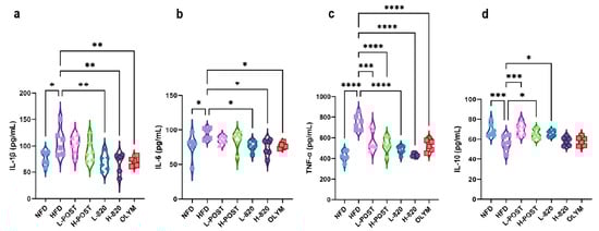 Obesity induces a chronic low-grade systemic inflammatory state, wherein adipose tissue dysfunction leads to abnormal secretion of adipokines (e.g., leptin and adiponectin) and pro-inflammatory cytokines such as TNF-α, IL-6, and IL-1β. Excessive lipid accumulation exacerbates pro-inflammatory adipokine secretion while downregulating anti-inflammatory mediators such as IL-10, resulting in a pathological imbalance. This imbalance can be ameliorated by therapeutic interventions. As shown in Figure 3a–d, serum concentrations of TNF-α, IL-1β, and IL-6 in HFD mice were significantly elevated, while IL-10 was markedly decreased. Figure 3a demonstrates that both the L-820 and H-820 groups, as well as the OLYM group, significantly attenuated the HFD-induced increase in IL-1β (p < 0.01). In Figure 3b, both the low- and high-dose probiotic groups, as well as the OLYM group, significantly reduced the upregulation of IL-6 (p < 0.05). Figure 3c shows that all intervention groups significantly suppressed the HFD-induced elevation of TNF-α. Additionally, the L-POST group (p < 0.001), the H-POST group (p < 0.05), and the L-820 group (p < 0.05) were notably effective in restoring IL-10 levels, reversing the downregulation induced by the HFD.
