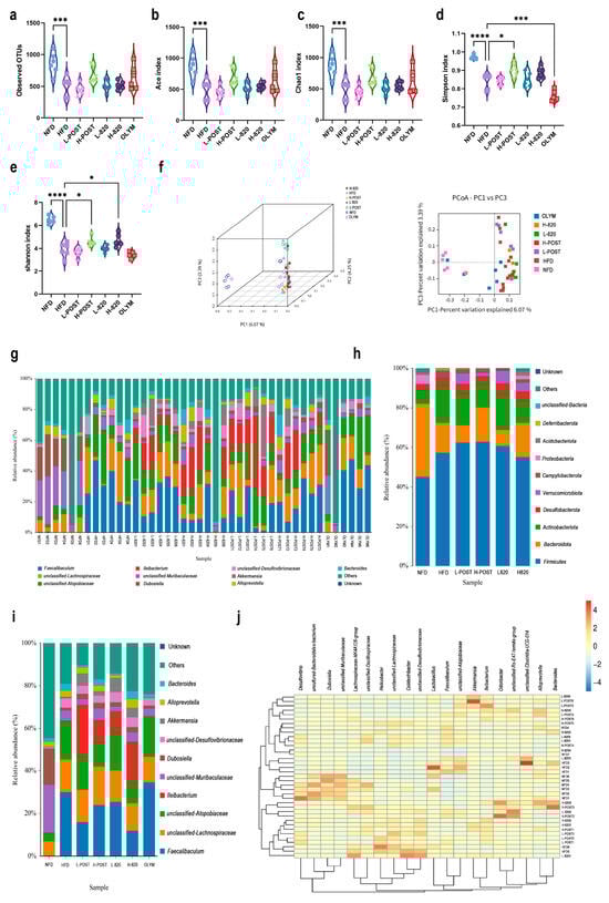 L. rhamnosus IOB820 and Postbiotics Modulate Gut Microbiota Composition in HFD Mice. (a–e) Alpha diversity indices: (a) Observed species richness; (b) ACE estimator; (c) Chao1 richness; (d) Shannon diversity index; (e) Simpson dominance index; (f) PCoA based on Bray-Curtis dissimilarity; (g) Taxonomic composition bar plots at genus level; (h,i) Relative abundance analysis of key bacterial phyla; (j) Heatmap visualization of differentially abundant taxa. Statistical significance: * p < 0.05, *** p < 0.001, **** p < 0.0001 vs. HFD group, n = 6.