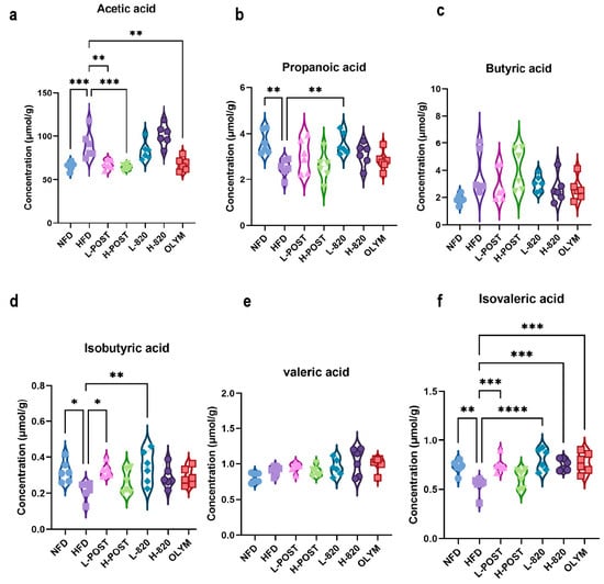 L. rhamnosus IOB820 and Postbiotics Reconstitute SCFA Profiles in HFD Mice. (a–f) Gas chromatography–mass spectrometry (GC-MS) quantification of cecal SCFAs: (a) Acetic acid; (b) Propionic acid; (c) Butyric acid; (d) Isobutyric acid; (e) Valeric acid; (f) Isovaleric acid. Statistical significance: * p < 0.05, ** p < 0.01, *** p < 0.001, **** p < 0.0001 vs. HFD group, n = 6.
