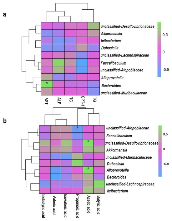 Spearman correlation between lipid metabolism (AST, ALP, TC, TG, CPT-1), SCFAs and microbial genera. (a) Correlations between lipid metabolism and microbial genera. (b) Correlations between SCFAs and microbial genera. Figure 7 was completed using the Wekemo Bioincloud (https:// www.bioincloud.tech accessed on 17 September 2025). * p < 0.05.
