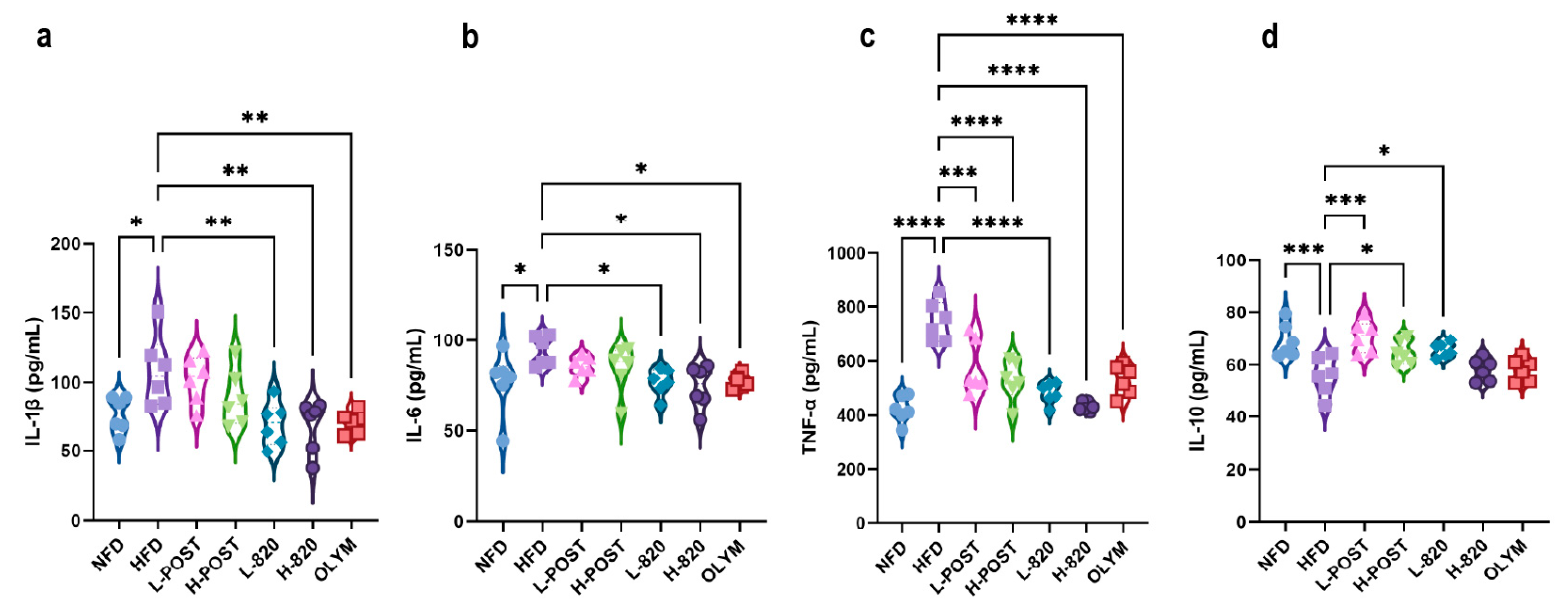 3.3. L. rhamnosus IOB820 and Its Postbiotics Attenuate Obesity-Associated Inflammation and Tissue Damage in HFD Mice