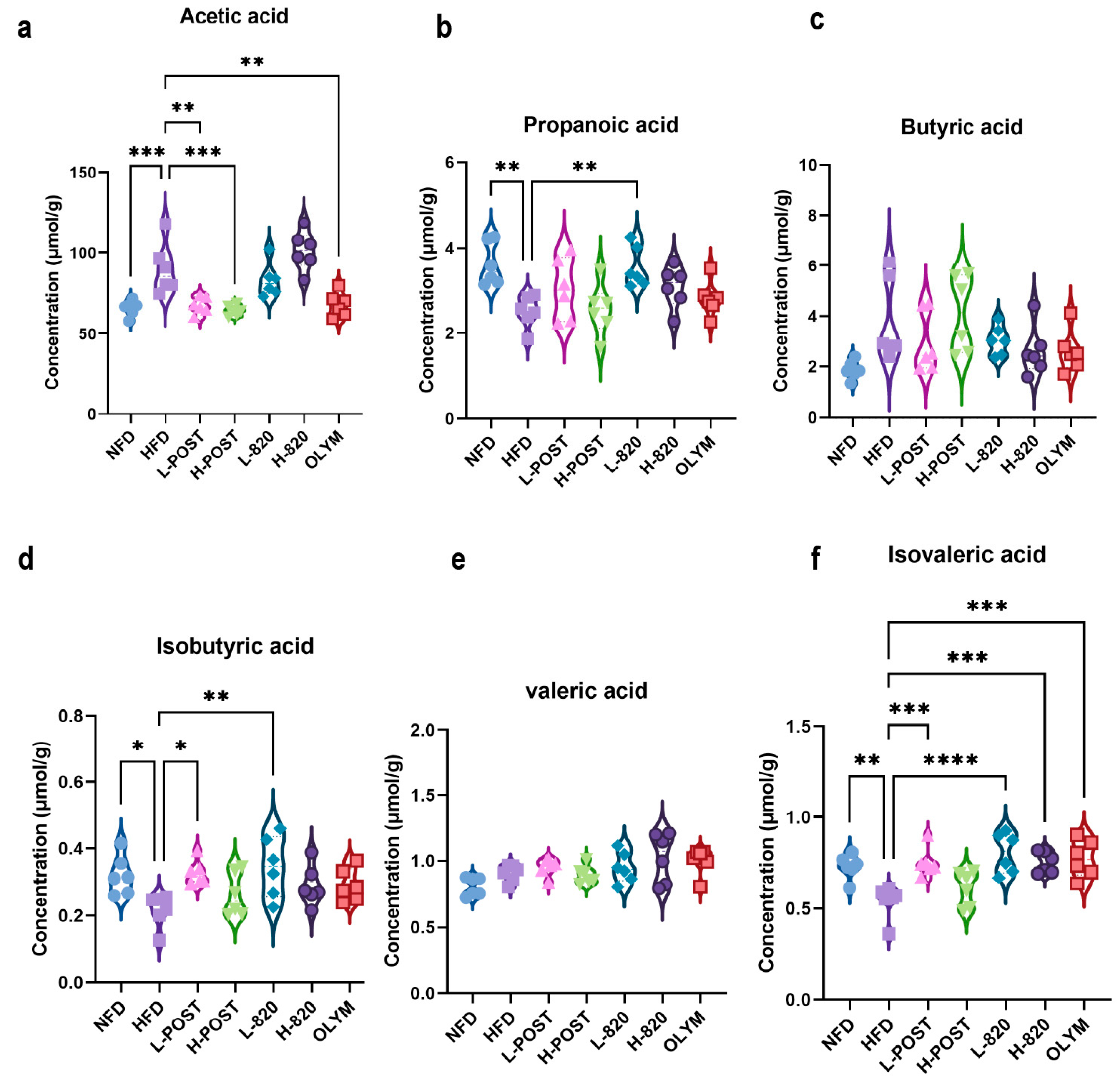 3.5. L. rhamnosus IOB820 and Its Postbiotics Modulate SCFA Production in HFD Mice