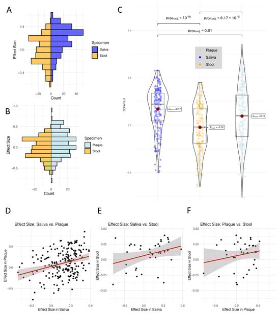 (A) Back-to-back histogram comparing the effect sizes between saliva (blue) and stool (orange) species. (B) Back-to-back histogram comparing the effect sizes between plaque (blue) and stool (orange) species. (C) Direct comparison of the effect sizes as beeswarm plots. Mean values and significance values are used to annotate the beeswarm plot and box plots per distribution are shown in the background for each sample type. (D) Scatter plot comparing the effect sizes in saliva to those in plaque. The regression is presented as red lines. The gray area represents the respective confidence interval. (E) Same panel as in (D) but for saliva and stool. (F) Same panel as in (D) for plaque and stool.