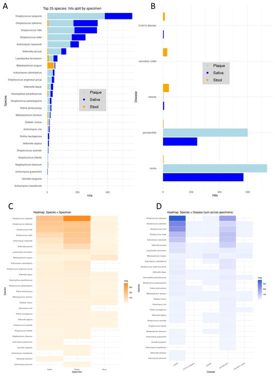 (A) Top 25 microbial species identified in the literature search, grouped by specimen type (saliva, plaque, stool). Most frequently reported species belong to the genera Streptococcus and Actinomyces, with predominant representation in oral samples. (B) Number of literature hits grouped by disease category. Caries and periodontitis dominate the published microbiome studies, while obesity, Crohn’s disease, and ulcerative colitis are represented by fewer but distinct associations. (C) Heatmap showing the distribution of literature hits per species across specimen types. Oral taxa such as Streptococcus sanguinis and Streptococcus salivarius show the strongest enrichment in plaque and saliva, whereas only few species, including Bifidobacterium longum, are also found in stool studies. (D) Heatmap summarizing literature associations by species and disease. Oral species are primarily linked to caries and periodontitis, while Bifidobacterium longum and Rothia mucilaginosa also appear in obesity and inflammatory bowel disease, indicating cross-compartment relevance.