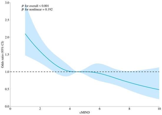 The association between cMIND diet with dementia using restricted cubic spline (RCS) regression analysis. Note: Model was adjusted for gender, age, residence, marital status, education level, living arrangement, economic status, smoking, drinking, exercise, hypertension, diabetes, heart disease, dyslipidemia, and body mass index. CI: confidence interval; OR: odds ratio. The solid blue line represents the estimated odds ratio of the outcome across varying levels of adherence to the cMIND diet, with the blue shaded area indicating the 95% confidence interval. The horizontal black dashed line represents the reference value (OR = 1.0).