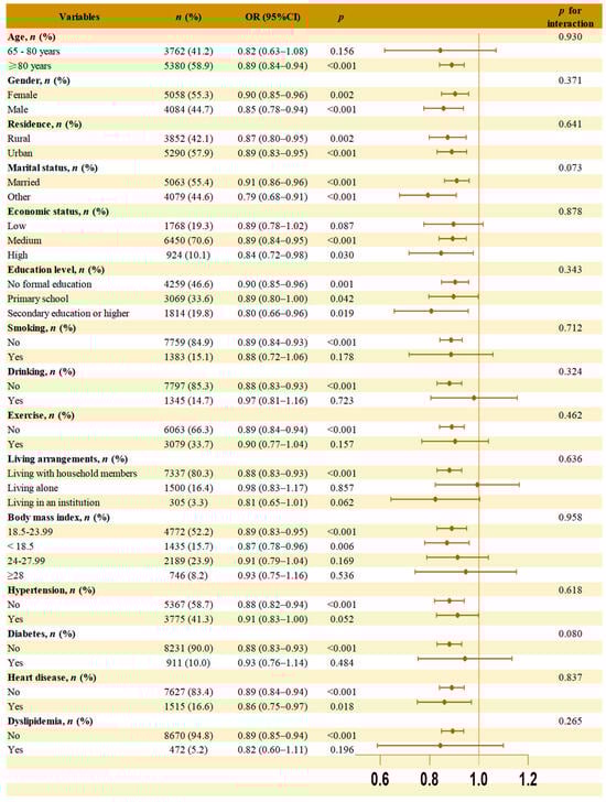 Subgroup analyses and interaction analysis of the association between cMIND diet and dementia. Note: Model was adjusted for gender, age, residence, marital status, education level, living arrangement, economic status, smoking, drinking, exercise, hypertension, diabetes, heart disease, dyslipidemia, and body mass index. The brown dot in each subgroup represent the OR values. The horizontal line through the dot represents the 95% confidence interval (95% CI). The orange vertical line indicates the reference value (OR = 1.0).