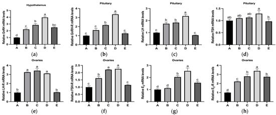 Total RNA from the hypothalamic, pituitary, and ovarian tissues was isolated using the TIANamp Tissue RNA Kit (Tiangen, Beijing, China). First-strand cDNA was synthesized from 1 μg of the total RNA using the PrimeScript RT Master Mix (Tiangen, Beijing, China) following the manufacturer’s protocol. The primer sequences were designed using the Primer 3.0 software and synthesized (Sangon, Shanghai, China). The primers used were as follows: GAPDH, F 5′-AGGTCGGTGTGAACGGATTTG-3′ and R 5′-TGTAGACCATGTAGTTGAGGTCA-3′; GnRH, F 5′-TGATGGCCGGCATTCTACTGC-3′ and R 5′-TGCCTGGCTTCCTCTTCAATC-3′; GnRHR, F 5′-GAGTGACAGTTACTTTCTTCC-3′ and R 5′-AGGAAGAAGCGTAACATTACC-3′; FSH, F 5′-TGCGGGCTACTGCTACACTAGG-3′ and R 5′-GCCAGGCAATCTTACGGTCTCG-3′; FSH-R, F 5′-GGTCTCCTTGCTGGCATTCTTGG-3′ and R 5′-CGGAATCTCTGTCACCTTGCTGTC-3′; LH-R, F 5′-TAACGAGACGCTTTATTCCGCCATC-3′ and R 5′-AGCATCTGGTTCTGGAGCACATTG-3′; LH, F 5′-GAGAATGAGTTCTGCCCAGTCTGC-3′ and R 5′-CAGTACTCGAACCATGCTAGGACAG-3′; E2, F 5′-CAGTCCATCCTACCCCTGGA-3′ and R 5′-TGCCGGGAACACTGTAGTTC-3′; E2-R, F 5′-TCCTCCTCATCCTTTCCCATATCCG-3′ and R 5′-GCATCTCCAGCAGCAGGTCATAG-3′. All primers showed acceptable efficiencies (92–108%), and GAPDH exhibited high expression stability (M = 0.28), confirming its suitability as the internal reference for reliable qRT-PCR normalization. For quantitative real-time reverse transcription polymerase chain reaction (qRT-PCR) analysis, cDNA served as the template and SYBR Green I staining (Tiangen, Beijing, China) was performed using the StepOne Plus Real-Time PCR System (Thermo Scientific, Waltham, MA, USA). The relative mRNA expression levels of each gene were calculated using the 2−∆∆Ct method.