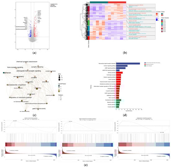 The results revealed that copper treatment significantly altered the hypothalamic gene expression profile, with 515 differentially expressed genes identified, of which 286 were upregulated and 229 were downregulated (Figure 4). GO and KEGG pathway enrichment analyses of these DEGs revealed that they were significantly enriched in multiple KEGG signaling pathways, including neuroactive ligand-receptor interaction, calcium signaling, GnRH signaling, GABAergic synapses, cAMP signaling, and cGMP-PKG signaling (Figure 4d). The top 20 enriched GO terms included changes in biological processes (BP), cellular components (CC), and molecular functions (MF) such as behavioral processes, synaptic transmission, brain development, neuropeptide signaling pathways, central nervous system development, feeding behavior, and neuropeptide hormone activity (Figure 4c). Further analysis revealed that, compared with the control group (Figure 4e), the upregulated gene KISS-1 was enriched in the GnRH pathway, while the downregulated gene GABAa and the upregulated gene PKC were co-enriched in the GABA signaling pathway. Validation using qRT-PCR showed that copper treatment upregulated the mRNA and protein levels of GnRH-related markers, which was specifically manifested as follows: the contents of kisspeptin and GnRH in rat hypothalamic tissues significantly increased (Figure 5c); the mRNA and protein expressions of KISS-1, GPR54, and PKC significantly increased, with a significant elevation in PKC phosphorylation level; concurrently, the GABA content in the hypothalamus and the relative mRNA and protein expression levels of GABA-R were significantly reduced (Figure 5a,b).