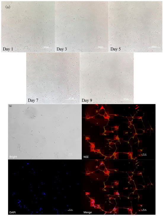 The experiment utilized 10 pregnant female SD rats (gestational day 17) purchased from Liaoning Changsheng Biotechnology Co., Ltd. (Shenyang, China), and these rats were of the same strain as those used in the in vivo experiment. Following euthanasia, fetuses were extracted on a sterile workbench and decapitated; the brain tissues were rapidly harvested and immersed in ice-cold HESS (Servicebio, Shanghai, China). The meninges and blood clots were carefully removed, and the hypothalamus was isolated (anterior–posterior boundaries: optic chiasm to the mammillary body; lateral boundaries: hypothalamic sulci; depth, approximately 1.5 mm). Brain tissues were rinsed with D-Hanks solution (Servicebio, Shanghai, China), minced into 1 × 1 × 1 mm fragments, and incubated in 0.125% trypsin (Thermo Scientific, Waltham, MA, USA) at 37 °C for 10 min. The digested tissue was resuspended in DMEM/F12 medium (1:1 ratio, containing 10% fetal bovine serum; Thermo Scientific, Waltham, MA, USA), filtered through a 100 µ-mesh cell strainer, and centrifuged at 1000 rpm for 5 min to collect the cell pellet. Cells were seeded at a density of 5 × 105 cells/cm2 onto glass slides pre-coated with poly-L-lysine (WHB, Shanghai, China) and cultured in a 37 °C incubator with 5% CO2. After 24 h, the medium was replaced with neurobasal medium (Thermo Scientific, Waltham, MA, USA) supplemented with 2% B27 and 1% GlutaMAX, and the medium was changed every 2~3 d. Cell morphology was observed under an inverted microscope on days 1, 3, 5, 7, and 9. After 7 d of culture, NSE immunofluorescence staining was performed. The cells were placed in culture plates, washed three times with phosphate-buffered saline (PBS), fixed with 4% paraformaldehyde for 15 min, and washed three times with PBS. The cells were permeabilized with 0.5% Triton X-100 (Beyotime, Shanghai, China) at room temperature (22–24 °C) for 20 min, rinsed thrice with PBS, and blocked with normal goat serum (Boster, Wuhan, China) at room temperature for 30 min. After removing the blocking solution, the primary antibody NSE (Affinity, Cincinnati, OH, USA, AF5473) was added and incubated overnight at 4 °C in a humidified chamber. The following day, the plates were washed three times with PBS and Goat anti-rabbit Cy3 (Proteintech, Rosemont, IL, USA, SA00009-2) was added, followed by incubation at 20~37 °C for 1 h and subsequent three washes with PBS. DAPI (Beyotime, Shanghai, China) was added, and the cells were incubated in the dark for 5 min to stain the nuclei, followed by washing four times with PBS. Finally, the cells were mounted with mounting medium containing an anti-fluorescence quencher and images were acquired under a fluorescence microscope.