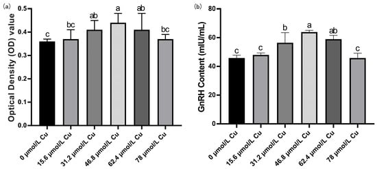 Screening for the optimal copper concentration in hypothalamic mixed neurons. (a) Cell viability OD value detection results. (b) GnRH content in cell culture medium (n = 3). Note: Within the same parameter, different letters (a, b, and c) indicate significant differences (p < 0.05), whereas the same letters or no letters indicate no significant difference (p > 0.05).