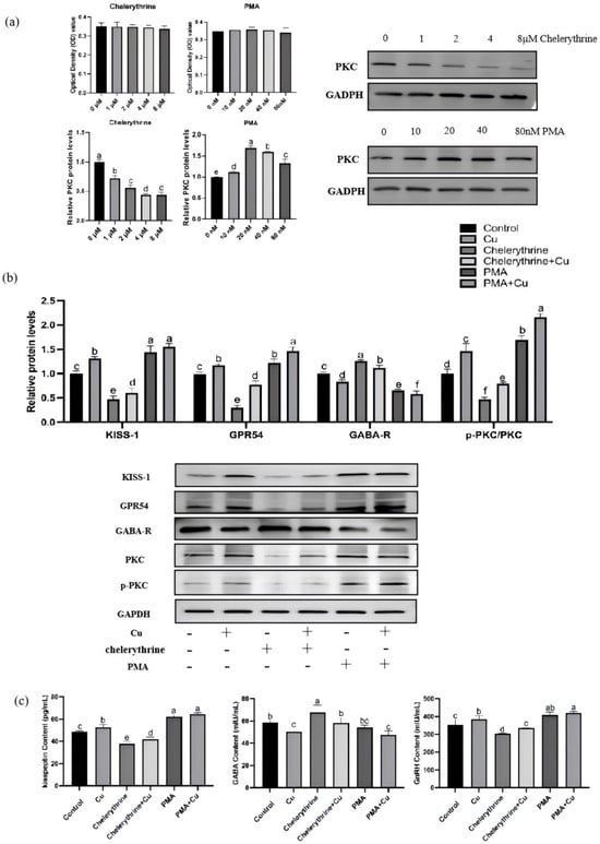 Based on the in vivo copper ion content in the hypothalamus of rats, the molar concentrations of copper ions in the in vitro cell culture medium were calculated and designed in gradients, and primary cultured hypothalamic mixed neurons were subsequently divided into six groups, with copper ion concentrations of 0 (control), 15.6, 31.2, 46.8, 62.4, and 78 μmol/L added to the culture medium in the form of CuSO4·5H2O (Sigma, St. Luois, MO, USA). Cell viability was assessed using the CCK-8 assay kit (Sangon, Shanghai, China). Ten microliters of the reagent were added to each well of a 96-well plate and incubated for 2 h. The GnRH levels in the culture medium were measured using a rat GnRH ELISA kit (MIbio, Shanghai, China). The assay was performed according to the manufacturer’s instructions, and the absorbance was read at 450 nm. GnRH concentration was calculated using a standard curve. After identifying the optimum copper concentration, further screening was performed to determine the optimal concentrations of the PKC activator (PMA) and the inhibitor (chelerythrine). All reagents were purchased from MedChemExpress (Monmouth Junction, NJ, USA). Using hypothalamic mixed neurons treated with the optimal copper concentration, different concentration gradients of PMA (0, 10, 20, 40, and 80 nM) and chelerythrine (0, 1, 2, 4, and 8 μM) were set for intervention, following the methodology reported by Takahito et al. []. Cell viability was assessed using the CCK-8 assay kit (Sangon, Shanghai, China). Western blot analysis was used to determine the levels of PKC in each treatment group, which reflected changes in PKC activity. This enabled the screening of the optimal concentrations of PMA and chelerythrine which significantly regulate PKC activity without inducing significant cellular toxicity, thus paving the way for subsequent mechanistic validation experiments.