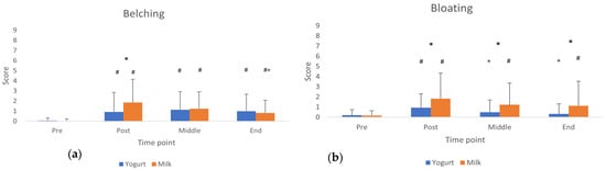 Belching (a) and bloating (b) values across measurement time points. * Difference between products (p < 0.05). # Difference from baseline (pre consumption). + Difference from Post Consumption (p < 0.05).