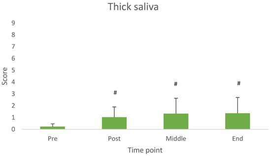 Values of thick saliva across measurement time points. Different from Pre-consumption (p < 0.05). # Difference from baseline (pre consumption) (p < 0.05).
