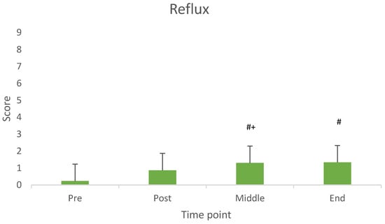 Values of reflux across measurement time points. # Difference from baseline (pre consumption) (p < 0.05). + Difference from Post Consumption (p < 0.05).